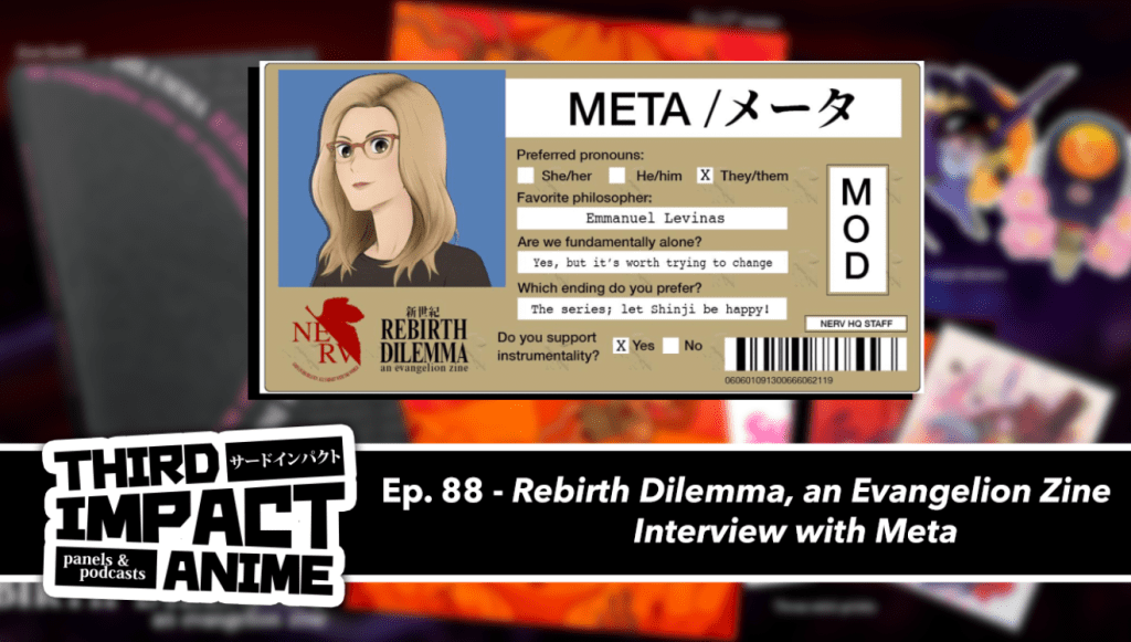 In this super special interview episode, Tori and Austin talk to Susan a.k.a. Metaandpotatoes about the incredible Neon Genesis Evangelion fanzine they put together called Rebirth Dilemma. Meta discusses how they came to become an Evangelion fan, how making a zine works, and tons more.